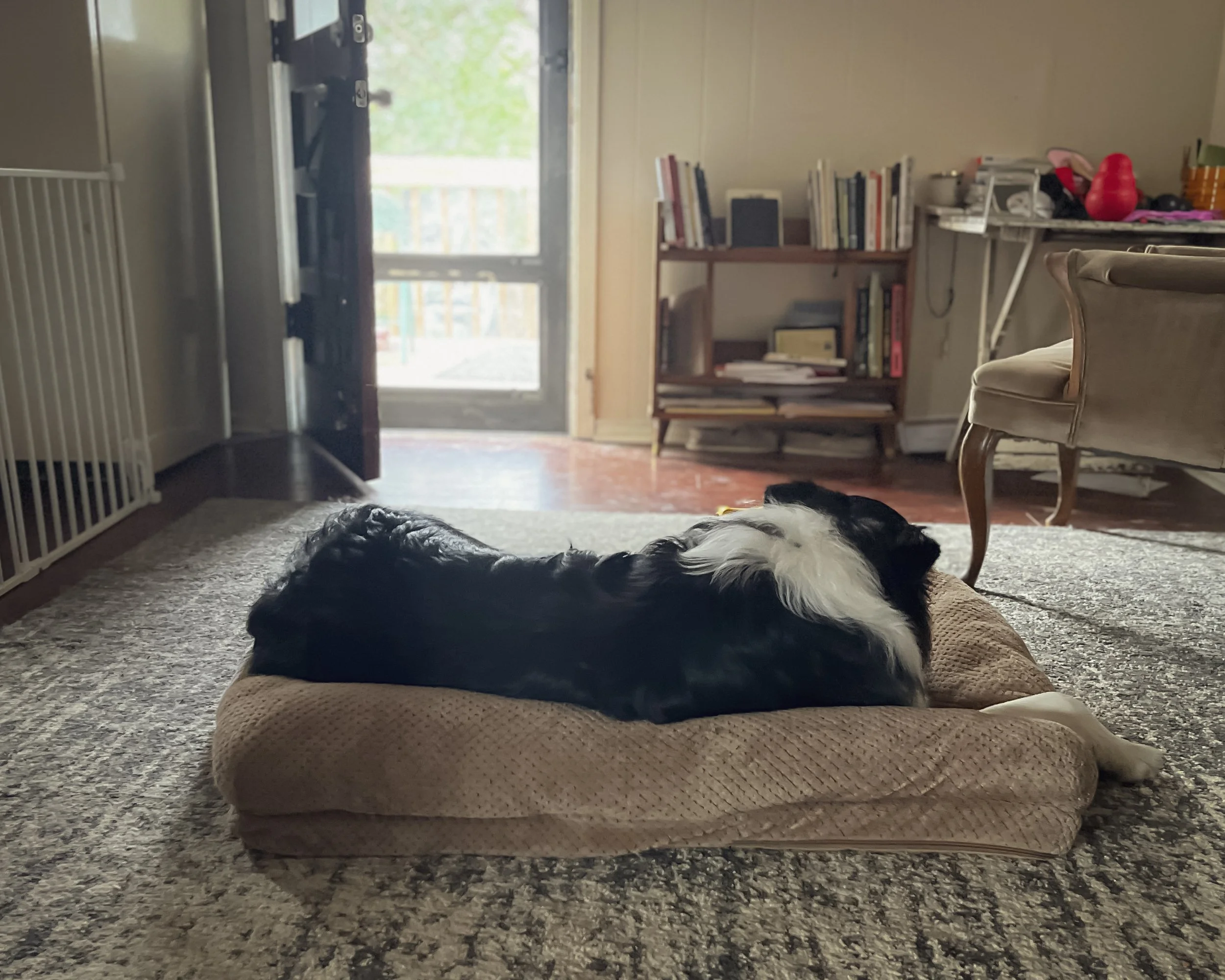 Every dog needs a physiological baseline for relaxation. Often inadvertently, we teach our dogs many things we do should be a cue for them to relax somewhere until we’re done. Things like, showering, sitting down in front of the computer, laying down in bed or sitting down for a meal are often cues to your dog you will not be interacting with them for a bit, so they’ll have to self-entertain or, even better, relax with you. However, there is a difference between doing a down and being able to quickly calm down on cue or in position.